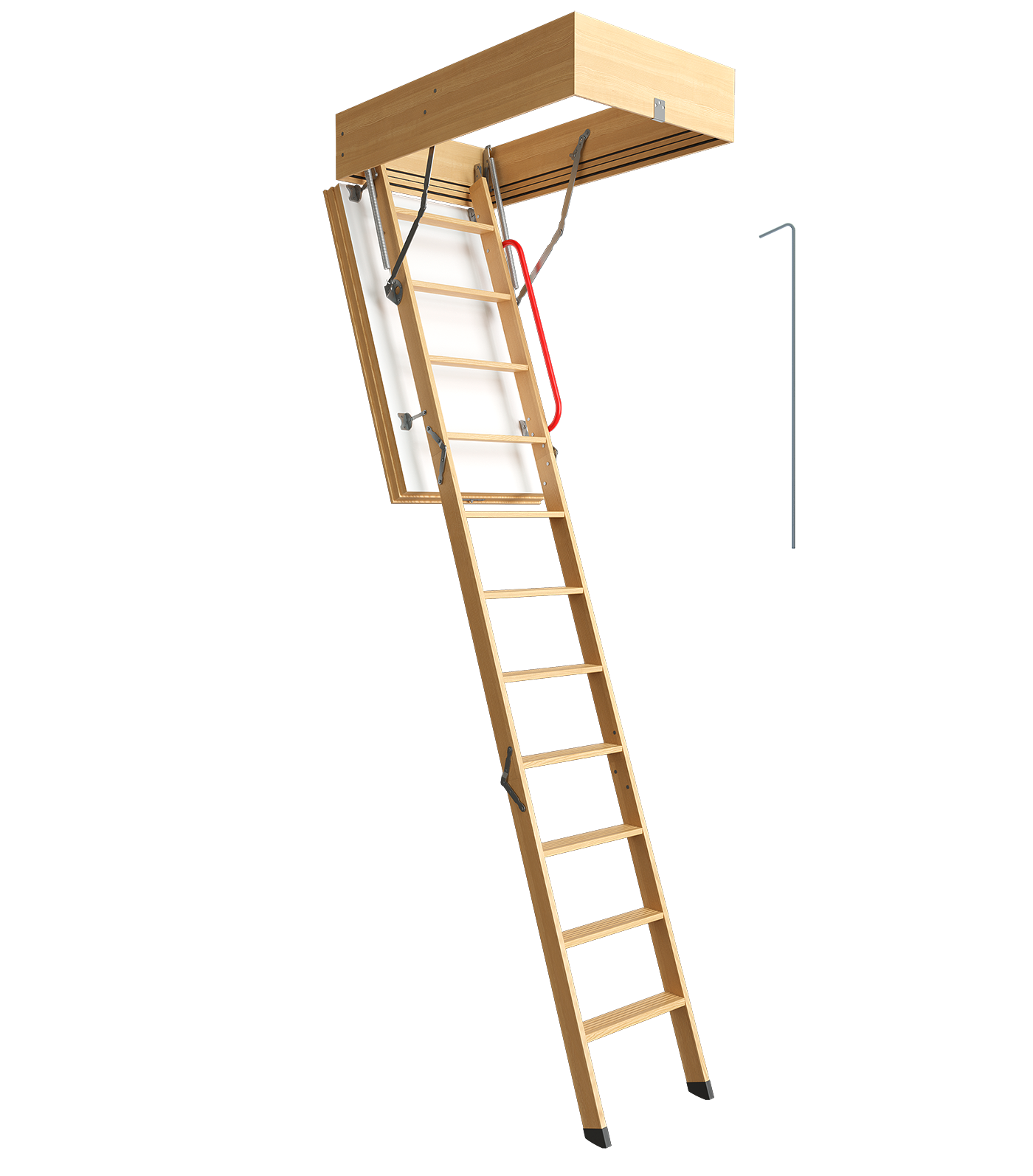 Используйте складную деревянную лестницу с люком, чтобы сделать подъем на чердак безопаснее и сохранить драгоценное пространство в частном доме. Крышка люка, окрашенная в белый цвет, делает конструкцию практически незаметной. Чтобы подняться на чердак, откройте люк ключом, который поставляет в комплекте, и разложите складные секции.