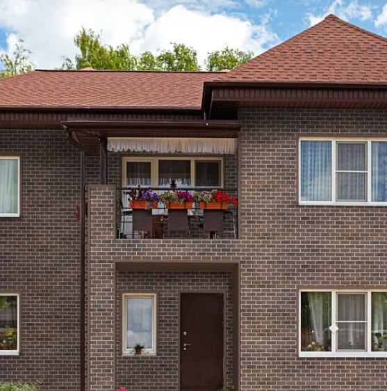 За основу палитры фасадной плитки ТЕХНОНИКОЛЬ HAUBERK взяты популярные оттенки кирпичной кладки: песчаный, терракотовый и обожженный кирпич. Для придания фасаду особой выразительности используются несколько оттенков базальтовой посыпки из одного сегмента цветовой палитры. Это позволяет каждый раз добиваться уникального запоминающегося рисунка фасада или его архитектурных элементов.