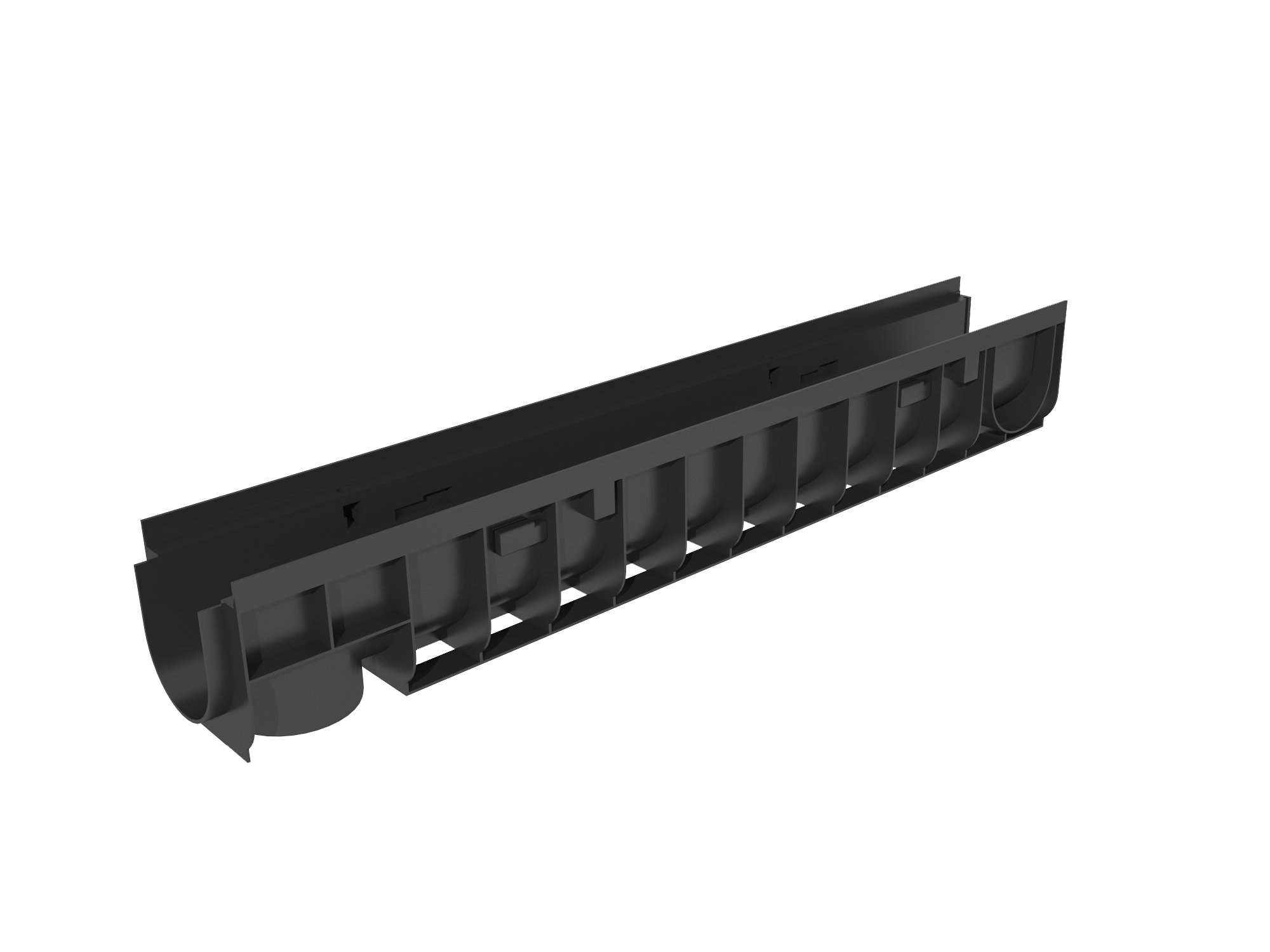 Лоток имеет систему креплений для стыковки аналогичных водосборников под углом в 900 и в продольном направлении. Может снабжаться заглушками, водоприемной решеткой, которая устанавливается в соответствующий паз лотка. Выпуск дождевой/технической воды нижний. Ребра жесткости продольные и поперечные.
